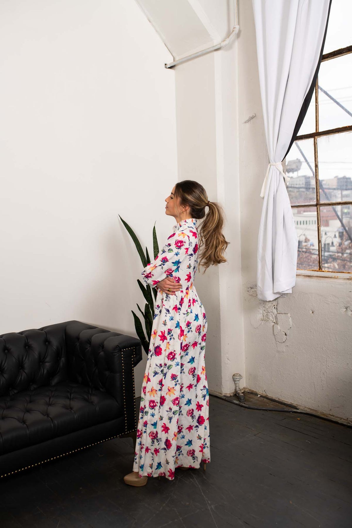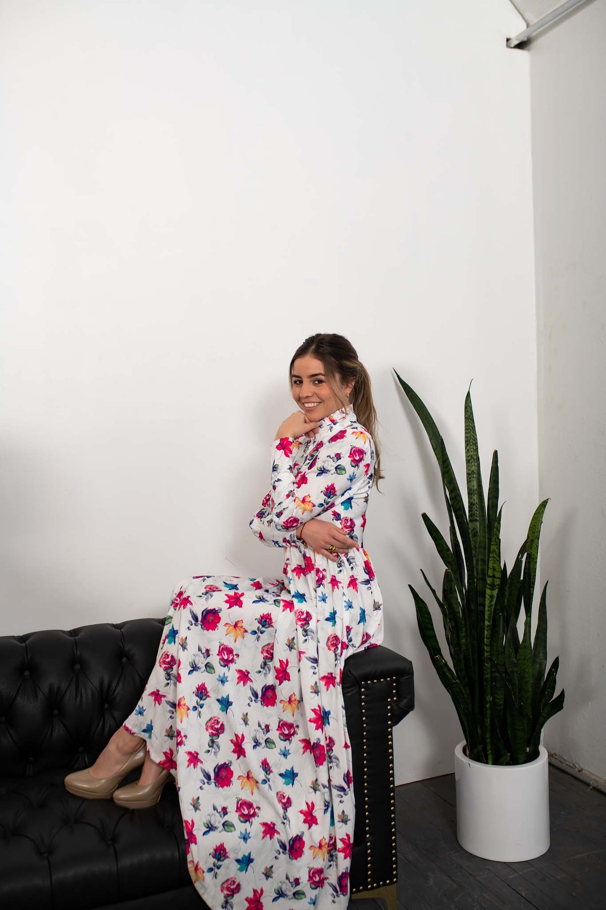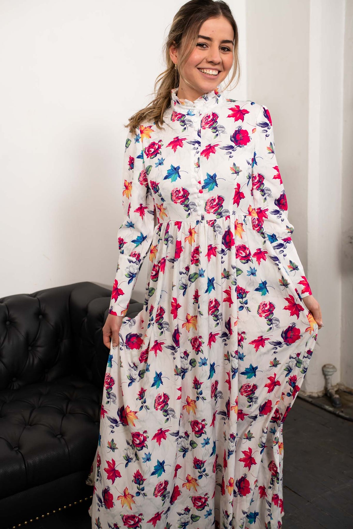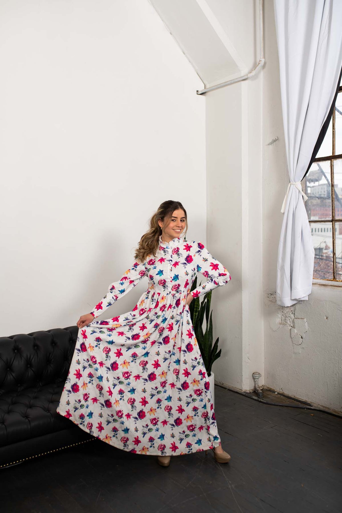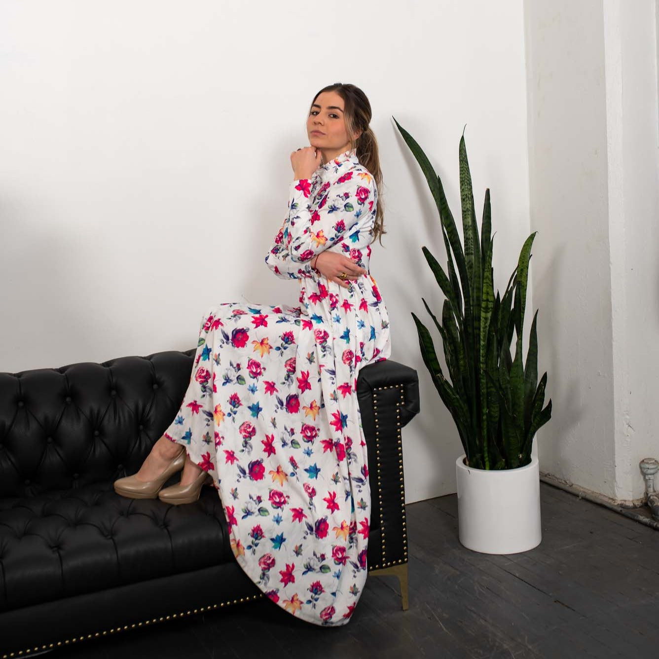 من قال إن الملابس المحتشمة والأنيقة لا يمكن أن تكون عصرية؟ هذا الفستان الأبيض الكلاسيكي المطبوع بنقشة عتيقة يجسد الأناقة بكل معانيها. إنه فستان متعدد الاستخدامات، يناسب جميع المناسبات.